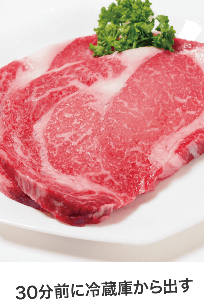 冷たい状態のまま焼くと、肉と室温の温度差があり、均一に火を入れることができません。