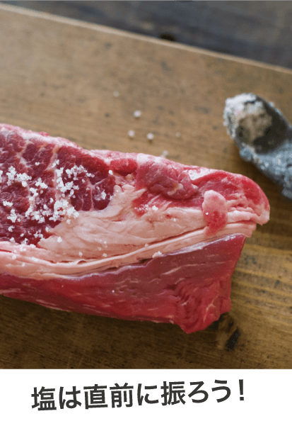 塩はなるべく焼く直前にふるようにして、肉の水分を奪ってしまわないように注意して下さい。