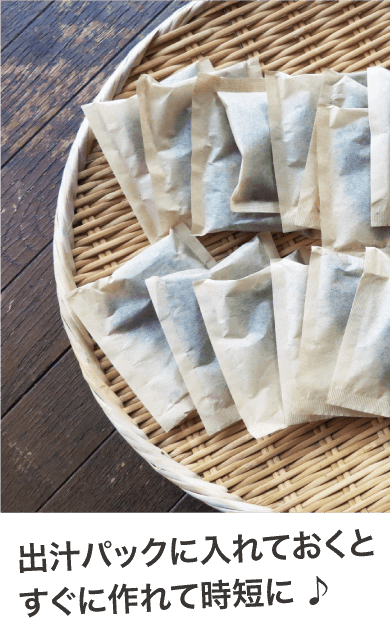 - 好みの出汁を「だしパック」(昆布等はそのままでも)